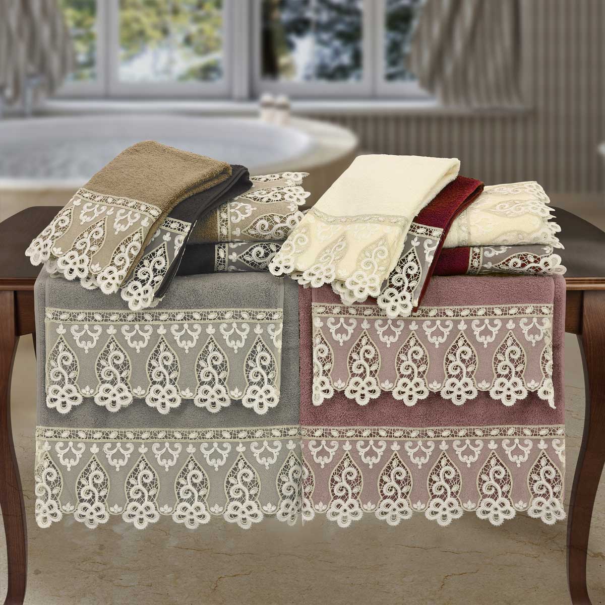 Set Cestino Legno Con 4 Asciugamani Spugna - Grigio, Per Bagno Ospiti