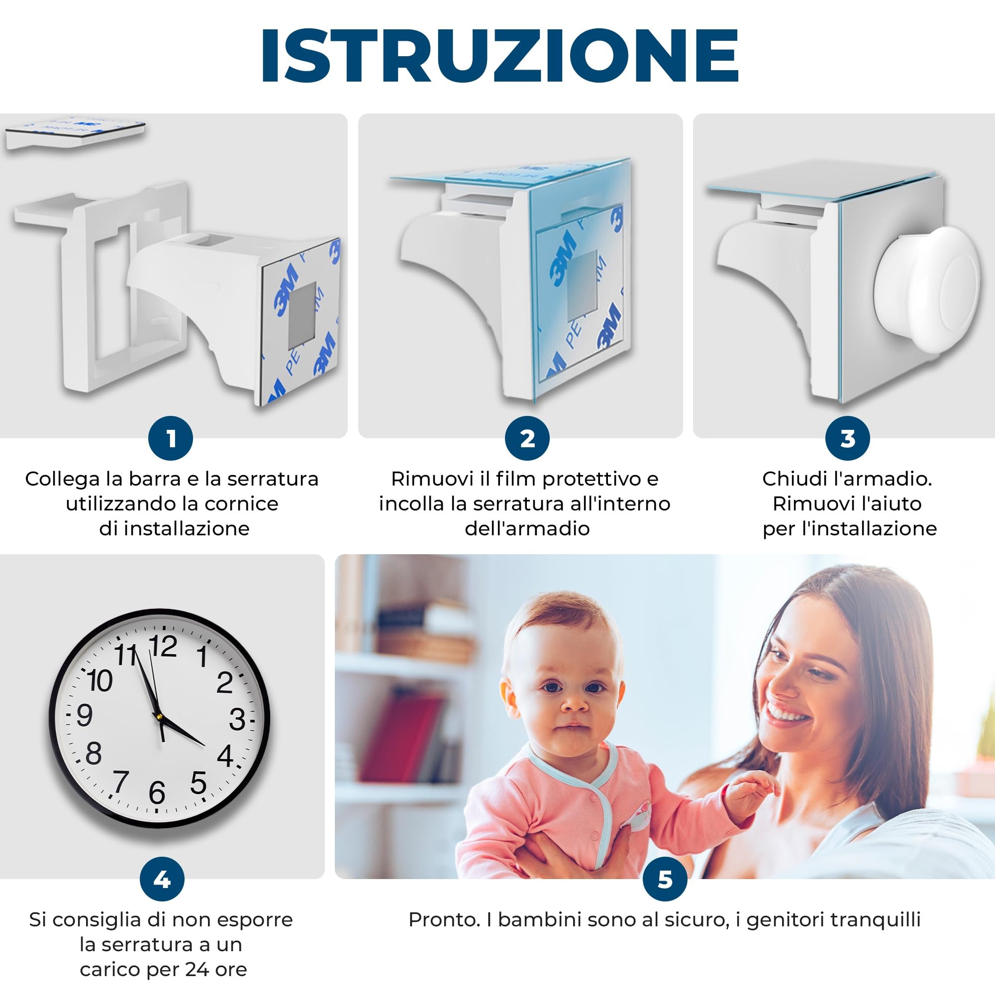 Mantieni il tuo bambino al sicuro con queste serrature adesive! Si applicano su cassetti, armadi, frigoriferi senza forare. Nastro 3M forte, trasparente e senza BPA. Dimensioni 18x3 cm. Facilissime da installare: pulisci la superficie, attacca e premi. Rimovibili senza lasciare residui. Garanzia di soddisfazione di 3 anni. Perfette per prevenire incidenti domestici. Un must per ogni famiglia con bambini curiosi!Caratteristiche e scheda tecnica