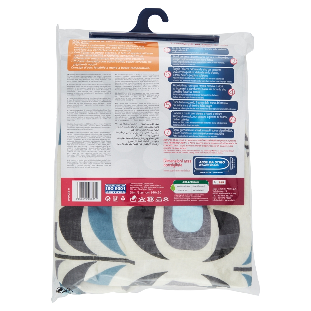 Questo telo Arix Stirokay è un must per chi stira spesso! Misura 140x50 cm, perfetto per la maggior parte delle asse da stiro. È in cotone stampato con colori solidi e senza sostanze nocive, quindi è sicuro per te e i tuoi vestiti. Il bordo elastico lo rende super facile da applicare e togliere - niente più struggle! Lavabile a mano a basse temperature, dura nel tempo. Io lo uso ogni settimana e stirare è diventato più smooth, i vestiti scivolano via senza intoppi. Un piccolo investimento per un grande comfort!Caratteristiche e scheda tecnica