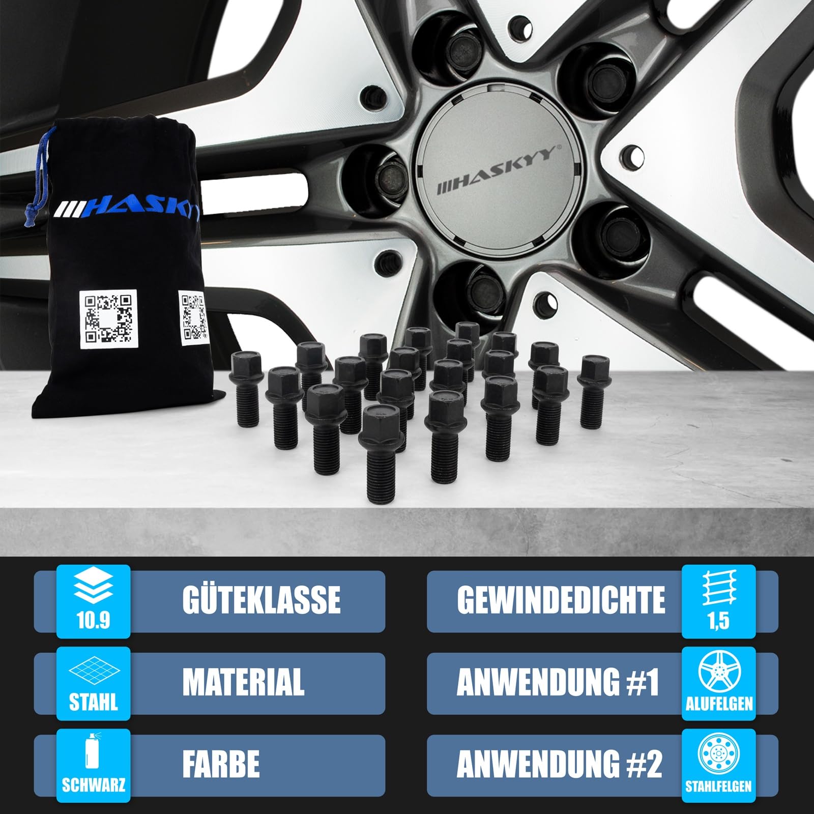 Questi bulloni per ruote sono robusti e affidabili! Confezione da 20 pezzi, filettatura M14x1.5, lunghezza 27 mm, seduta sferica R13 e diametro 26 mm. Si usano con chiave da 17 mm e sono zincati per resistere alla ruggine. Compatibili con molte auto: VW Golf, Polo, Passat; Audi A1-A8; Seat Leon, Ibiza; Skoda Octavia, Fabia e altri. Classe di qualità 10.9 e made in UE, quindi sicuri e duraturi. Perfetti per cerchi in lega o acciaio. Montali e dimentica i problemi!Caratteristiche e scheda tecnica