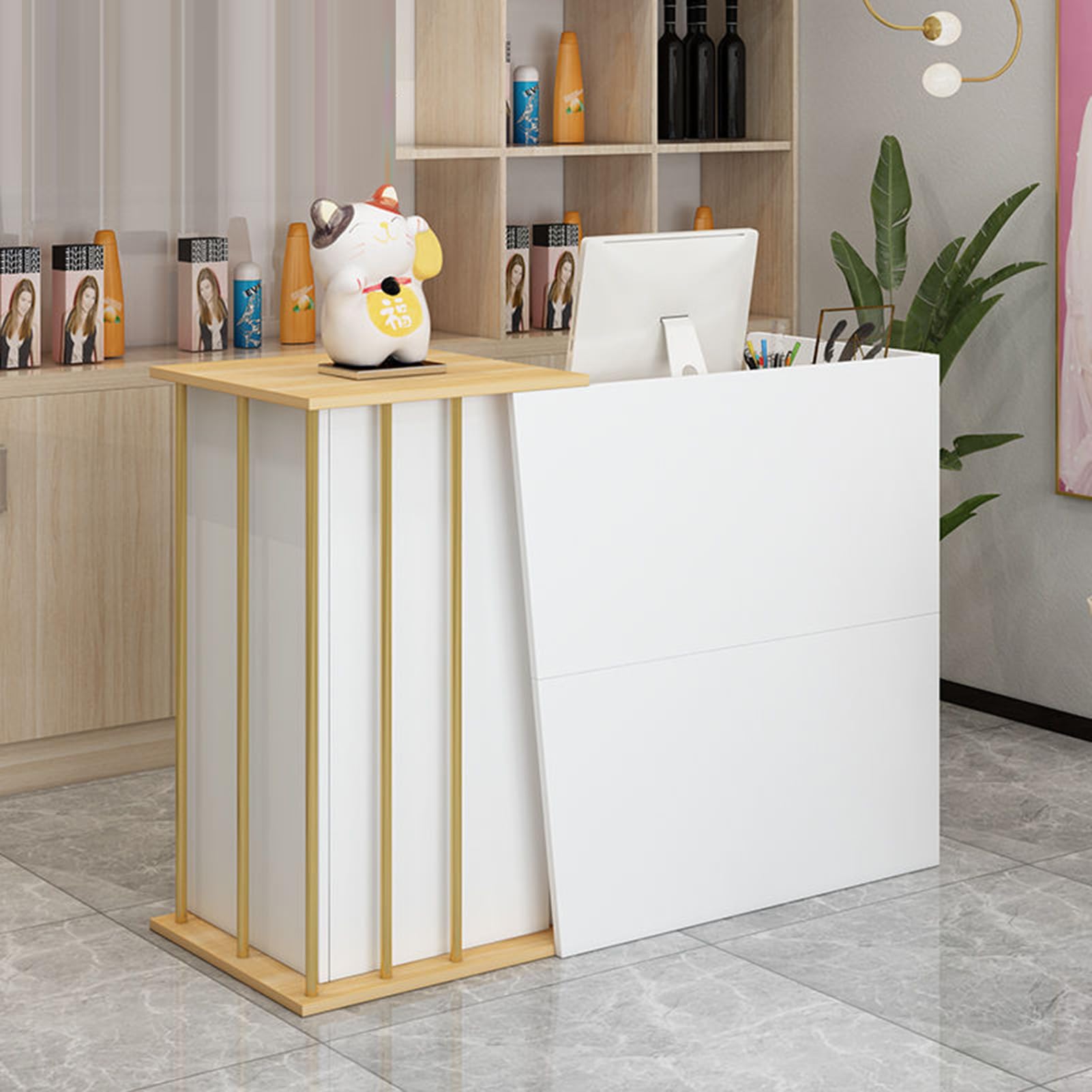 Questo bancone reception è proprio quello che serve per dare un'aria professionale al tuo negozio, centro estetico o hotel! Misura 100x40x90 cm (ma ci sono anche taglie più grandi se ti serve più spazio), è in legno di alta qualità con finitura bianco lucido super elegante. Ha cassetti con chiusura a chiave per documenti importanti, un armadio spazioso per oggetti più grandi e ripiani per tenere tutto in ordine. Si monta facilmente grazie alle istruzioni chiare e ai pezzi etichettati. Perfetto anche come leggio o per presentazioni. Pratico, funzionale e di stile!Caratteristiche e scheda tecnica