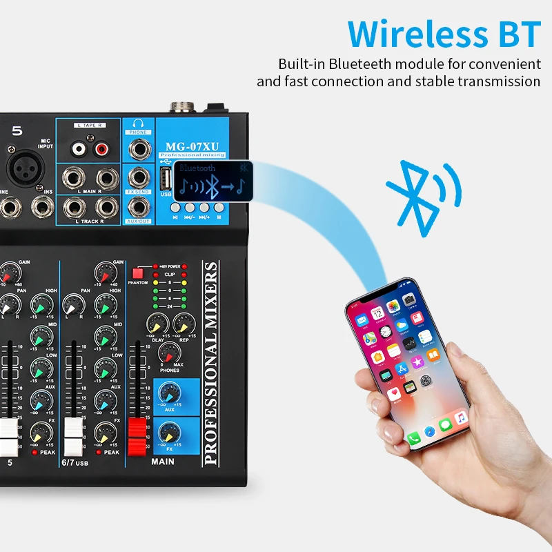 Questo mixer audio 5 canali è versatile e professionale! Con ingressi XLR, USB, Bluetooth e alimentazione phantom 48V per microfoni a condensatore. Include effetti eco/ritardo, EQ e uscite per cuffie. Perfecto per registrazione, live streaming, podcast o piccoli eventi. Collegabile a computer, smartphone o chiavette USB. Un alleato indispensabile per chi cerca qualità audio e facilità d'uso.Caratteristiche e scheda tecnica