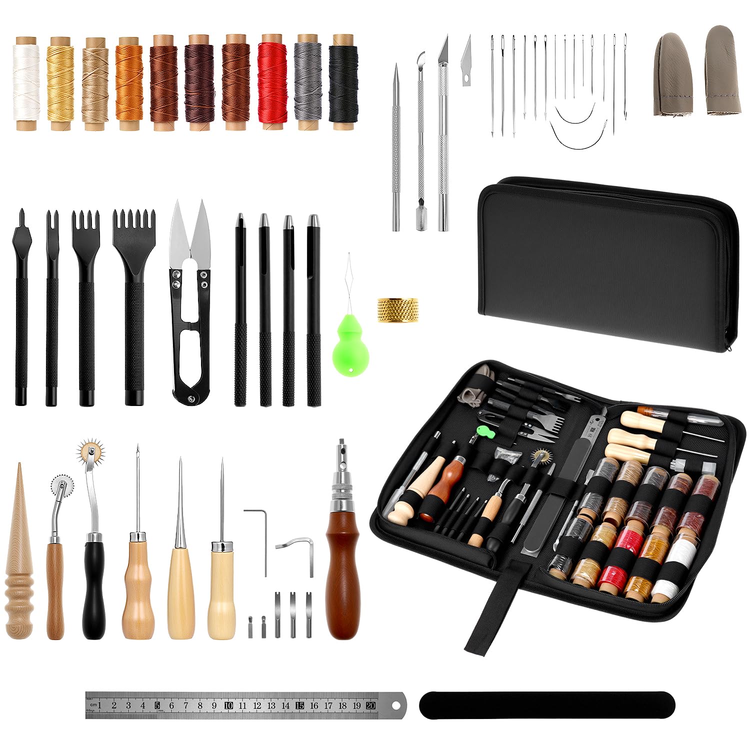 Per gli amanti del fai da te e della pelletteria, questo kit è completo di tutto! Include fili cerati colorati, punzoni di diverse misure (1-6mm), strumenti per stampaggio, martello, aghi, e molto altro. Ideale per creare portafogli, riparare divani o personalizzare accessori. Gli attrezzi hanno manici antiscivolo e sono organizzati in una pratica custodia. Perfetto per principianti e professionisti. Un regalo originale e utile per chi ama creare con le proprie mani.Caratteristiche e scheda tecnica