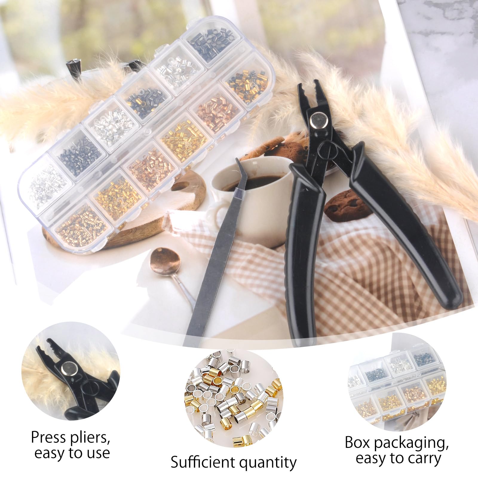 Hai voglia di creare gioielli unici? Questo kit da 800 pezzi include tutto il necessario: anelli aperti (4mm,5mm,6mm,8mm), chiusure a moschettone, ganci orecchini, perline crimpate e molto altro. In metallo argentato, con scatola organizzata. Perfetto per principianti e appassionati per realizzare braccialetti, collane, orecchini. Età consigliata: dai 14 anni in su. Libera la tua creatività!Caratteristiche e scheda tecnica