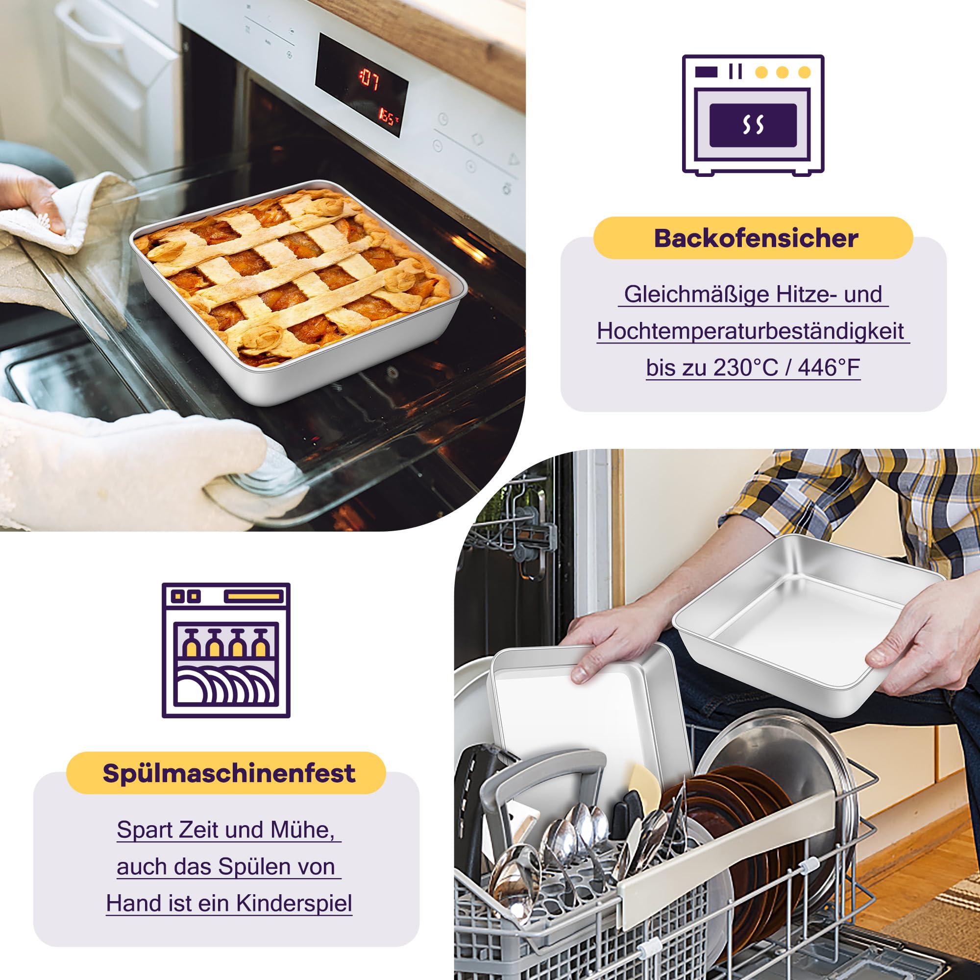 Questi stampi Herogo sono fantastici per la cucina! Il set include 2 stampi quadrati in acciaio inox alimentare, dimensioni 21x21x5 cm. Sono resistenti, non rilasciano sostanze nocive e hanno bordi lisci e arrotondati per una presa comoda. Si usano in forno e freezer, sono lavabili in lavastoviglie e perfetti per brownie, lasagne, torte, cannelloni e altro. Il design monopezzo è a prova di perdite e facile da pulire. Ideali anche come regalo per appassionati di cucina!Caratteristiche e scheda tecnica