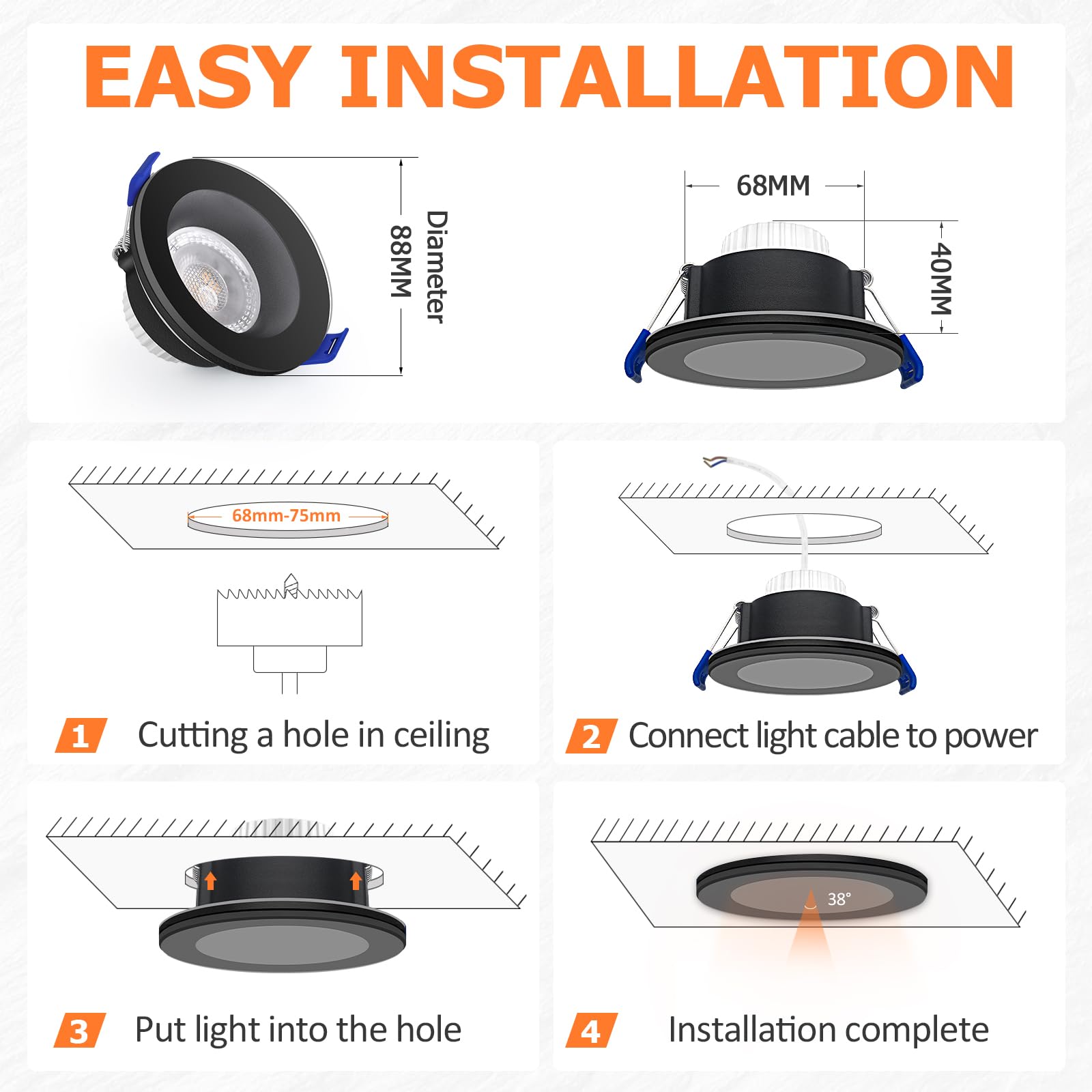 Questi faretti LED sono fantastici per illuminare casa! Sono dimmerabili con l'interruttore normale: hai 3 livelli di luce (450LM, 260LM, 190LM). Ultrasottili (24mm), si installano in un foro da 75-85mm. Impermeabili IP44, perfetti per bagno o balcone. Luce naturale 4000K, senza sfarfallio, proteggono gli occhi. Set da 20 pezzi, collegamento diretto a 220-240V. Ideali per soggiorno, cucina, camera... e con 3 anni di garanzia!Caratteristiche e scheda tecnica