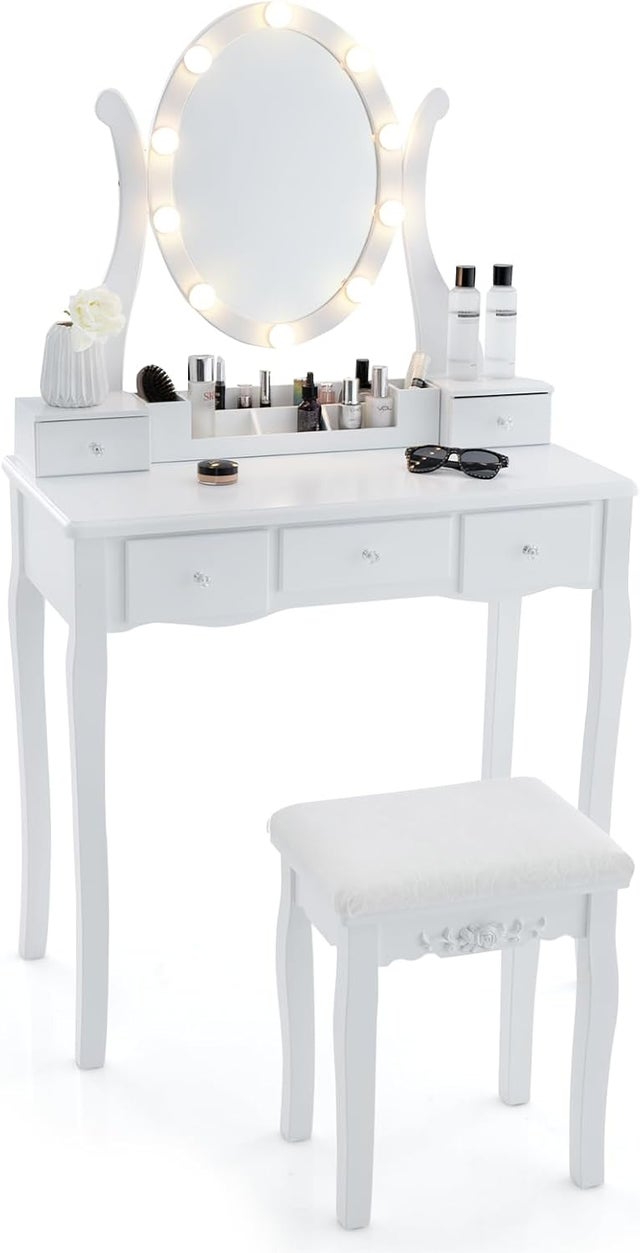 Se cerchi una toeletta completa per la tua routine di bellezza, questa di HOMCOM è perfetta! Ha tutto quello che ti serve: uno specchio enorme con 9 luci LED integrate che ti illuminano perfettamente mentre ti trucchi, così non sbagli nemmeno un colpo. Poi ha 2 cassetti spaziosi e 5 ripiani dove mettere tutti i tuoi cosmetici, profumi, gioielli e accessori - finalmente tutto in ordine! Lo sgabello è imbottito e super comodo, ideale per sederti con calma. È fatto in MDF e truciolato resistente, quindi regge bene (fino a 40 kg il tavolo, 140 kg lo sgabello). I piedini sono regolabili per adattarsi anche su pavimenti un po' storti. Montarlo è semplice, viene con tutte le istruzioni. In più è bianco, un colore che sta bene in qualsiasi camera da letto. Pratico, funzionale e pure bello da vedere - che volere di più? Misure: 80x40x138 cm, perfetta anche in spazi non enormi. Davvero un affare per chi ama avere tutto a portata di mano la mattina!Caratteristiche e scheda tecnica