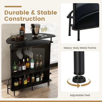 Ciao amante del divertimento! Questo tavolo da bar è perfetto per creare un angolo chic in casa tua! Struttura in acciaio nero robusta e piani in truciolare effetto noce. Sotto il piano, ha due binari per calici e ripiani per organizzare accessori. Le griglie tengono fino a 6 bottiglie di vino. Dimensioni: 120x40x105 cm, ideale per affiancare sgabelli da bar. Perfetto per cucina, sala da pranzo o lounge. Design elegante e funzionale. Trasforma i tuoi party con stile!Caratteristiche e scheda tecnica