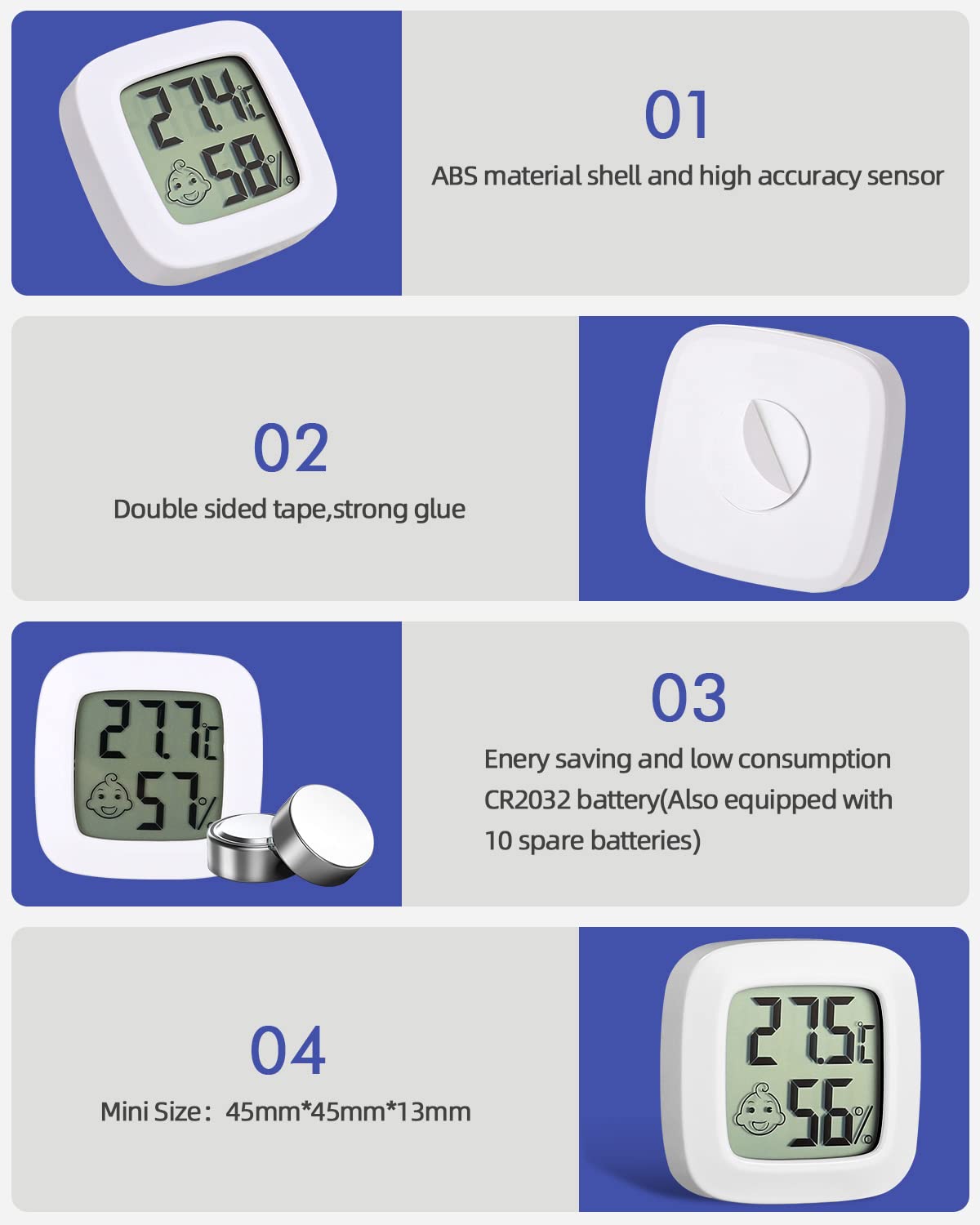 Questo termoigrometro Vemfay è proprio utile per controllare il clima di casa! Misura temperatura (da -50°C a +70°C) e umidità (10-99% RH) con precisione, e aggiorna i dati ogni 10 secondi. Ha un display LCD da 3.7 pollici facile da leggere, e mostra anche data e ora. Ma la cosa più figa è l'indicatore di comfort con faccine che ti dicono se l'aria è secca, comoda o umida. Così sai quando accendere il deumidificatore o l'umidificatore. Si appende al muro (con magnete o foro), sta in piedi su un tavolo o lo attacchi al frigo. Perfetto per camera da letto, soggiorno, ufficio, serra... Incluso batterie e manuale. Un gadget essenziale per il benessere di tutta la famiglia!Caratteristiche e scheda tecnica