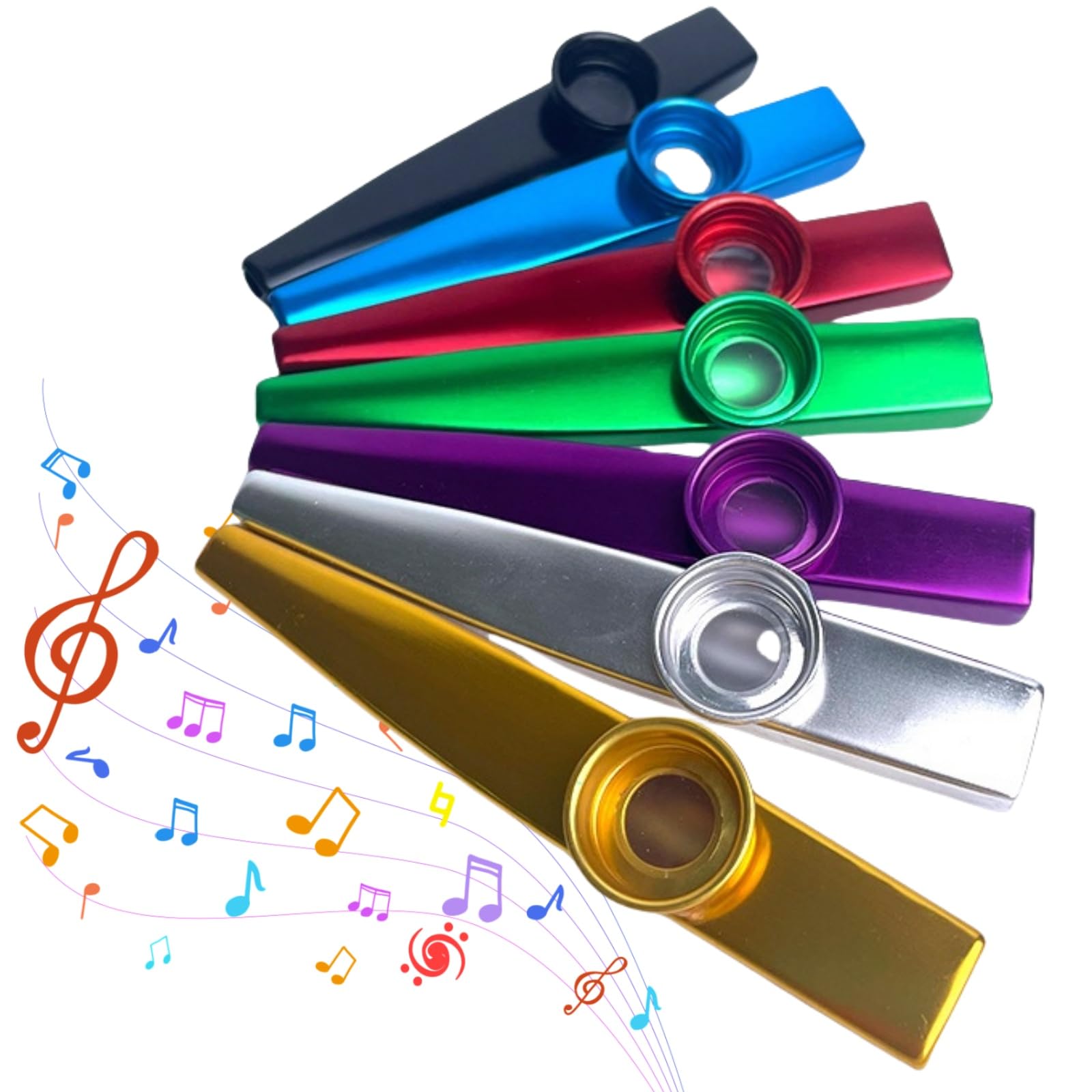 Divertiti con questo set di 6 kazoo in lega di alluminio! Sono super leggeri, facili da portare in tasca e perfetti per bambini e adulti che vogliono suonare senza essere esperti. Ogni kazoo è lucido e liscio, con colori vivaci: oro, argento, azzurro, verde, rosso e viola. Basta vibrare la gola (non soffiare!) per produrre suoni chiari e melodiosi. Sono ottimi come accompagnamento per chitarra, violino o piano. Attenzione: se arrivano con un leggero odore, basta lavarli con acqua e farli arieggiare. Un regalo originale e divertente per appassionati di musica!Caratteristiche e scheda tecnica