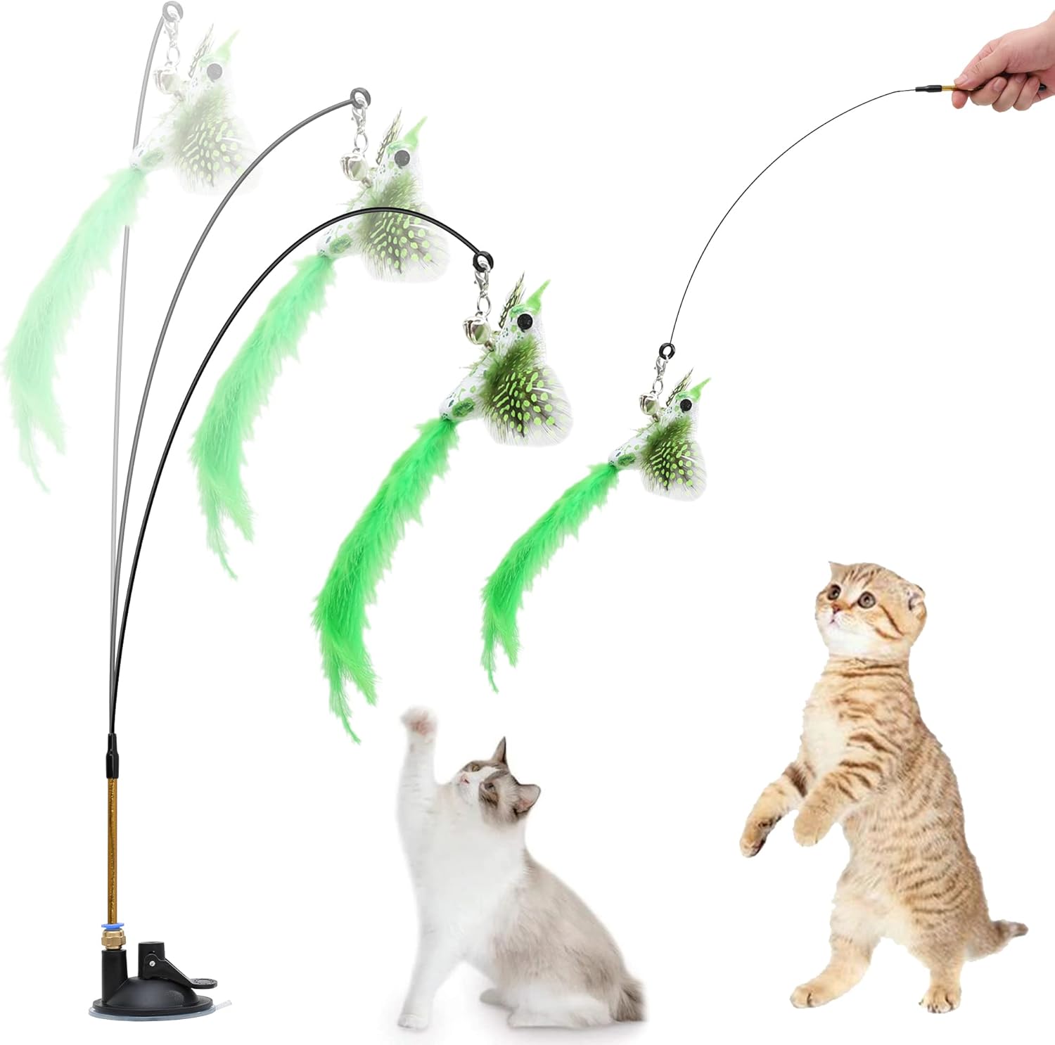 Questo set di 10 giochi per gatti farà impazzire di gioia il tuo micio! Include un'asta elastica con ventosa (che regge fino a 9 kg), 9 ricariche intercambiabili: pesce volante rosa, farfalla blu, coccinella viola e 5 vermi. Le piume, i colori vivaci e la campana stimolano l'istinto di caccia. Due modalità: manuale (tieni l'asta) o automatica (fissa con ventosa su vetro, piastrelle, ecc.). Realizzato in filo d'acciaio flessibile e materiali sicuri. Perfetto per far giocare il gatto da solo o interagire con lui. Un ottimo modo per rafforzare il legame e mantenerlo attivo!Caratteristiche e scheda tecnica