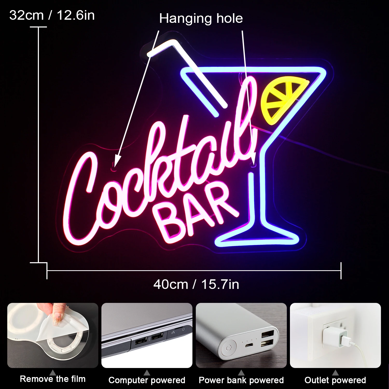 Crea atmosfera con questa insegna al neon! Alimentazione USB 5V, luce dimmerabile dal 10% al 100%. Materiali eco-silicone e acrilico, sicuri e resistenti. Perfetta per bar, hotel, feste o come luce notturna. Facile da appendere con fori inclusi. Colore bianco caldo. Prezzo cool per un effetto wow!Caratteristiche e scheda tecnica