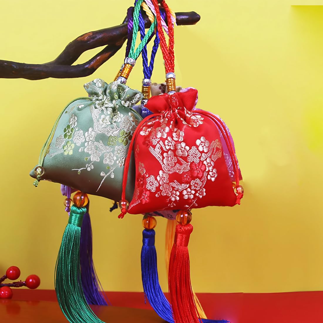 4 Ventagli Pieghevoli In Bambù Con Nappe - Stile Cinese Per Matrimoni, Decorazione E Regali
