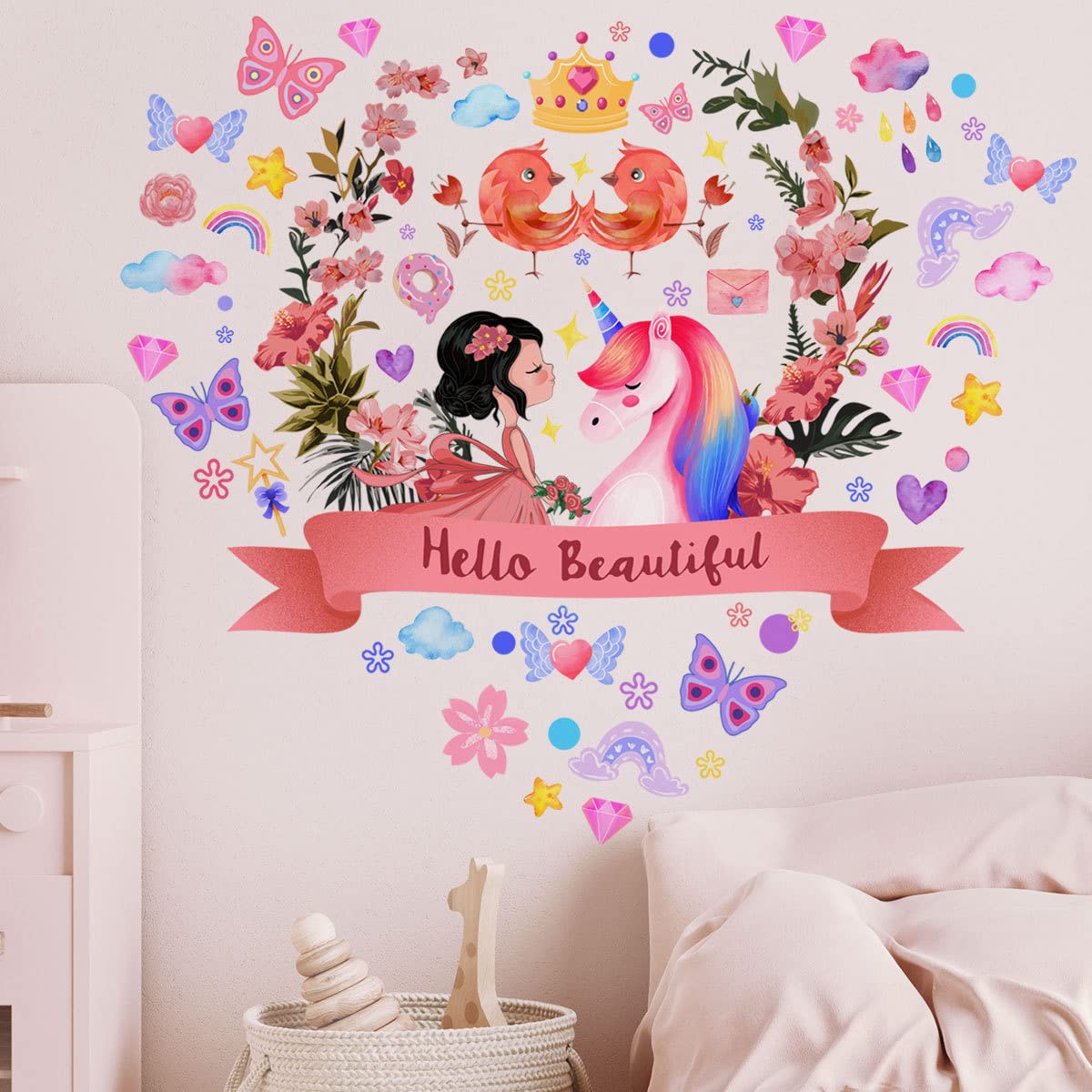 Vuoi trasformare la cameretta dei tuoi bambini in un mondo magico? Questi adesivi murali unicorno sono perfetti! Sono coloratissimi, facili da applicare e rimovibili senza danneggiare le pareti. Il set include due unicorni (uno con criniera rosa e uno viola), corone di fiori, nuvole, stelle, farfalle, cuori e un arcobaleno. Li applichi in pochi minuti: stacchi la pellicola, incolli e il gioco è fatto. Sono realizzati in vinile di alta qualità, opaco e atossico, quindi sicuri per i bambini. Puoi metterli su pareti lisce e pulite (anche in bagno, ma evita l'umidità eccessiva). Attenzione: non sono riutilizzabili, ma si possono riposizionare durante l'applicazione. Le dimensioni finali sono circa 101x72 cm, ma puoi arrangiarli come vuoi. Ideali per creare un'atmosfera giocosa e fantastica. Se si staccano, contattaci e ti aiutiamo!Caratteristiche e scheda tecnica