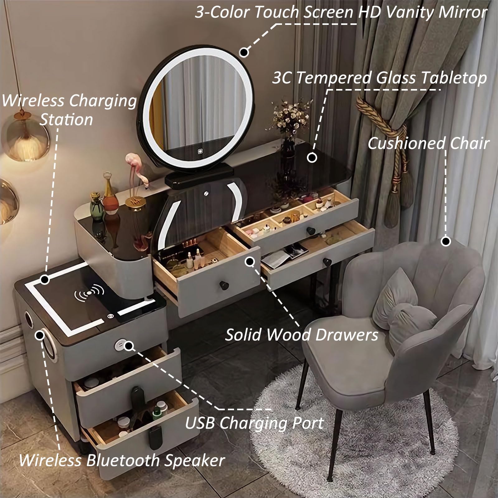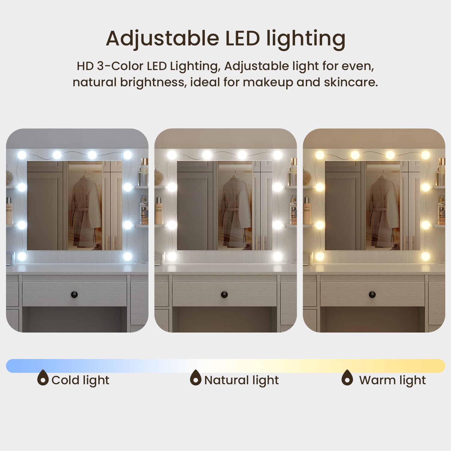 Questa toeletta è tutto ciò che serve per la tua beauty routine! In MDF bianco, ha 6 cassetti, 3 ripiani aperti, e 3 nascosti per massimo spazio. Lo specchio ha luci LED con 3 temperature colore (fredda, naturale, calda) e luminosità regolabile. Include anche uno sgabello. Design elegante, adatto a stili moderni o classici. Facile da montare con istruzioni chiare. Perfetta per organizzare trucchi, gioielli, accessori. Trasforma la tua stanza in un salone di bellezza!Caratteristiche e scheda tecnica