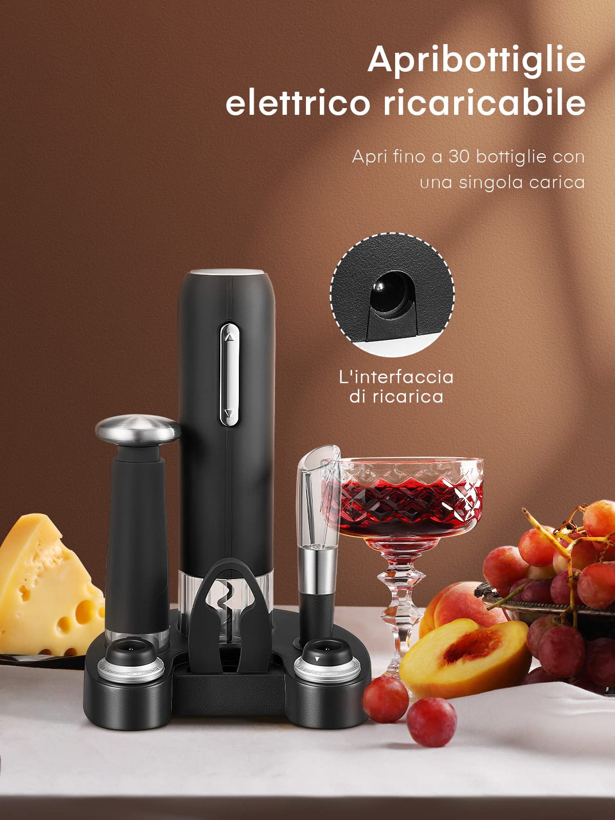 Apri le bottiglie di vino senza sforzo con questo cavatappi elettrico Magden! Basta premere un pulsante e in 7 secondi il tappo è fuori. Con una carica di batteria, apre fino a 100 bottiglie, perfetto per feste o cene. Il design è elegante e moderno, in nero, con impugnatura ergonomica. Realizzato in ABS e PC resistenti agli urti, è duraturo e facile da pulire. Il set è un regalo ideale per appassionati di vino, compleanni, Natale o occasioni speciali. Portatile, funziona a batterie, quindi puoi usarlo ovunque: in casa, all'aperto o in viaggio. Stile e praticità in un solo prodotto!Caratteristiche e scheda tecnica