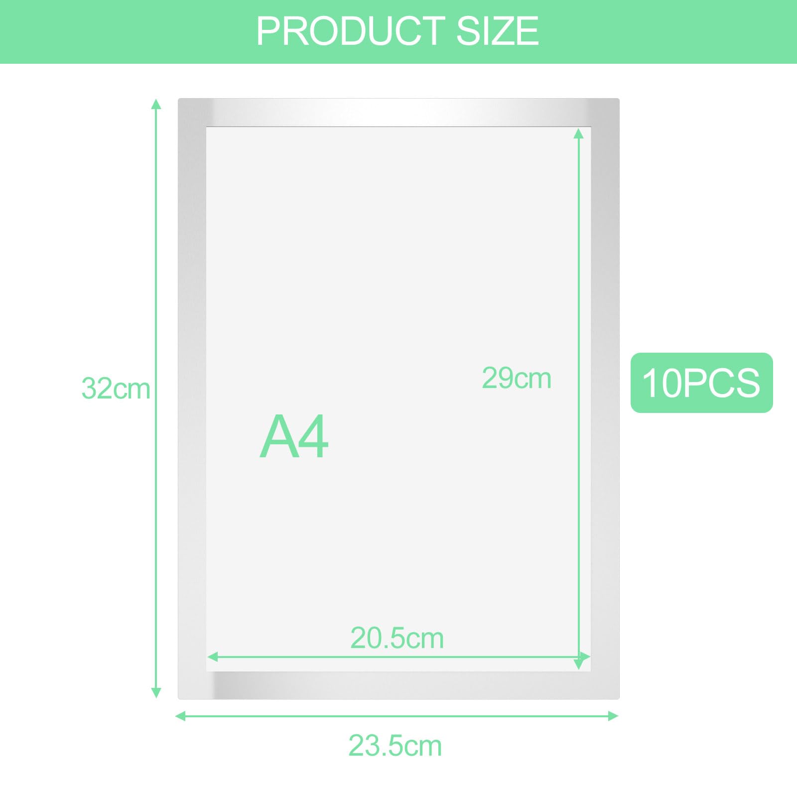 Queste cornici magnetiche A5 (21x14.8cm) sono super pratiche! Si attaccano con adesivo, senza forare pareti. Perfette per poster, foto, menu, orari di lavoro. Si usano su frigoriferi, vetrine, armadi. Materiale PVC trasparente e impermeabile. Il design con apertura su tre lati permette di cambiare il contenuto in un secondo. Ottime per negozi, uffici, scuole, o casa. Consegna in 10 pezzi. Economiche e versatili. Ideali per promozioni o organizzazione domestica.Caratteristiche e scheda tecnica