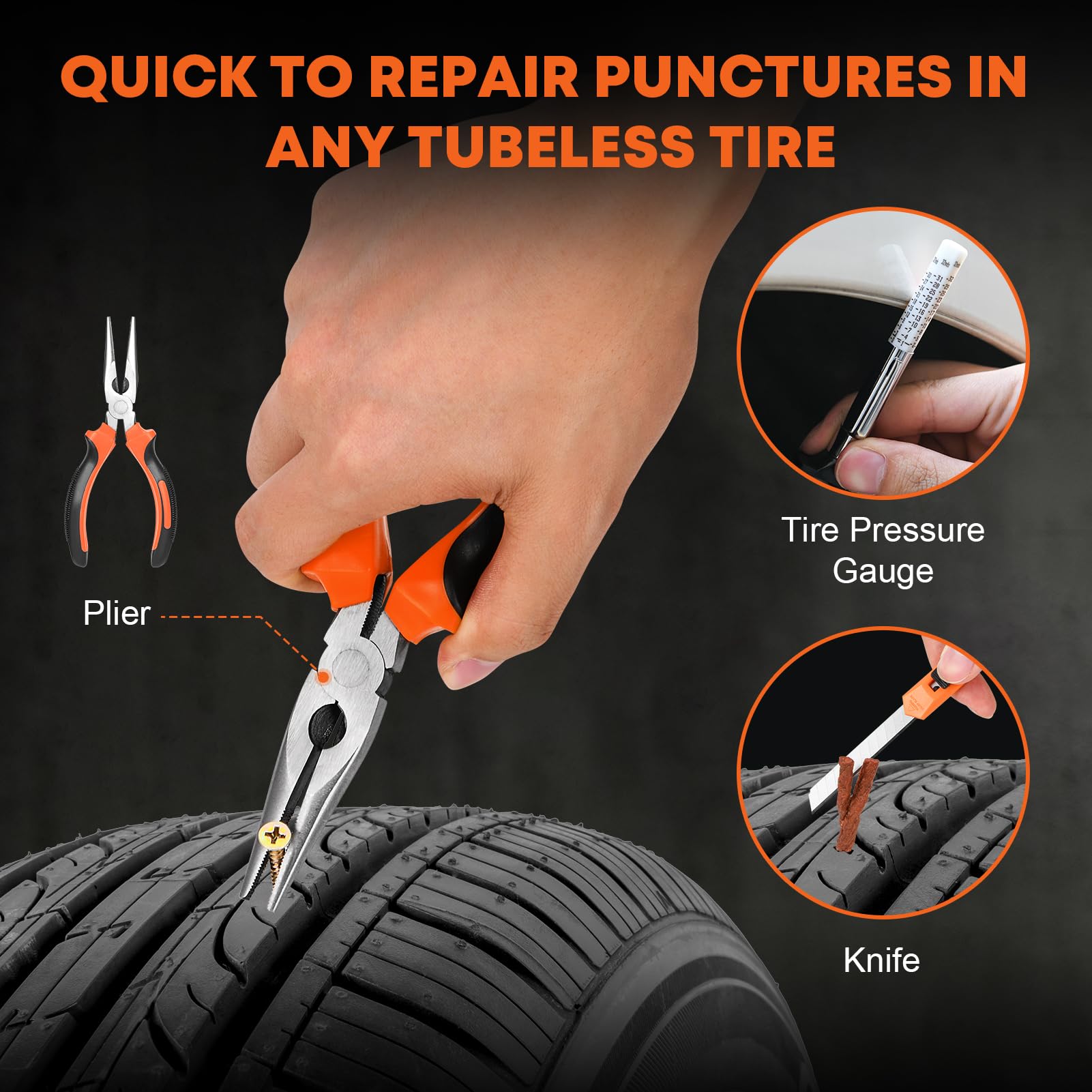 Questo kit di riparazione pneumatici è un salvavita per chi viaggia! Include 10 viti con mastice in gomma (5 per ogni misura) per tappare fori senza smontare la gomma. Fatto in acciaio resistente, sigilla bene e non danneggia lo pneumatico. Perfetto per auto, moto, bici, scooter e camion. Attenzione: è una soluzione temporanea, non superare i 35 km/h e raggiungi un gommista al più presto. Tienilo in auto per ogni evenienza!Caratteristiche e scheda tecnica