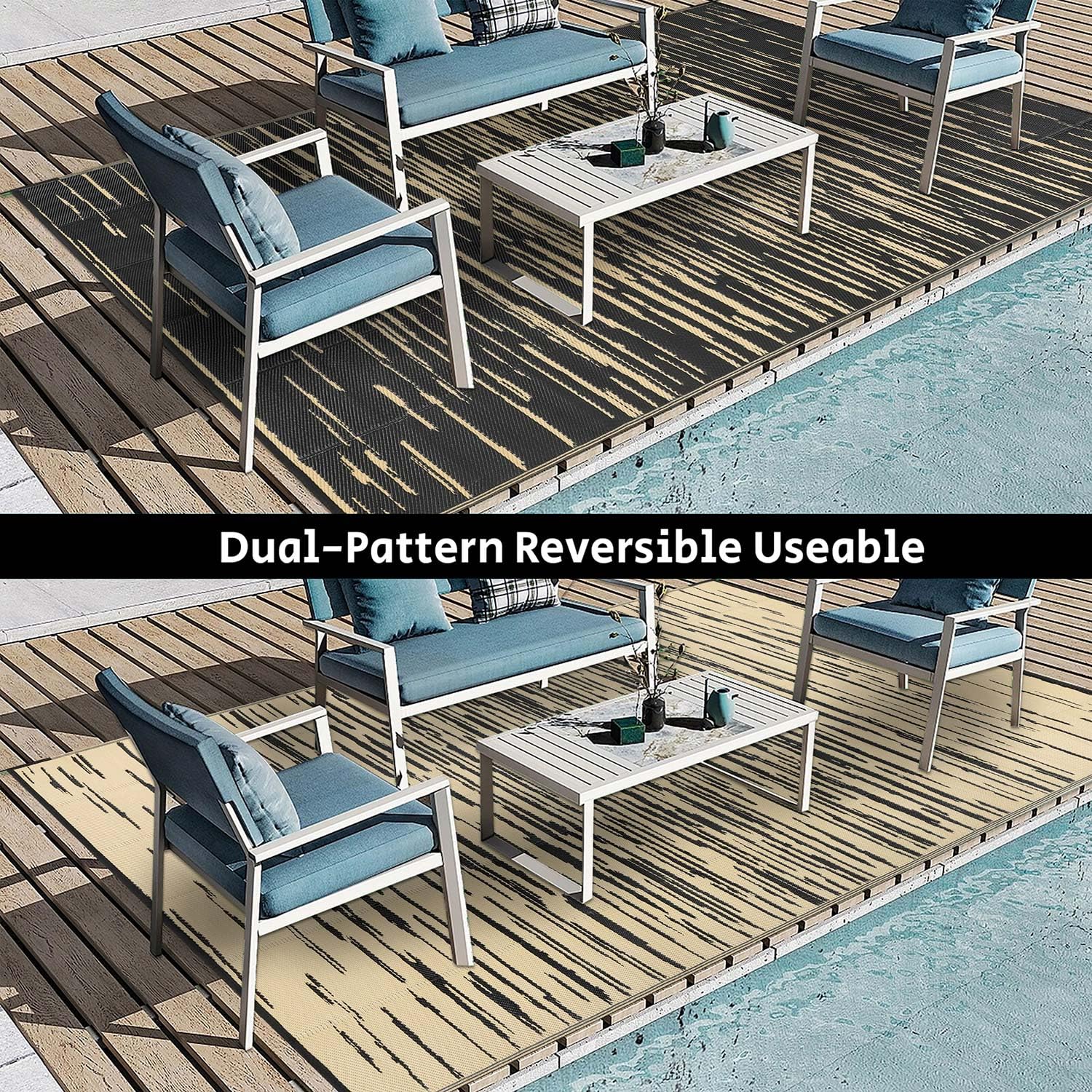 Questo tappeto da esterno della Fambiay è enorme (245x305 cm) e super pratico! Realizzato in plastica riciclata, è impermeabile, resistente ai raggi UV e facile da pulire: basta scuoterlo o passare un panno umido. Il design reversibile lo rende versatile per balcone, terrazza, giardino, spiaggia o campeggio. Leggero e pieghevole, ha quattro anelli angolari per fissarlo al terreno ed evitare che voli via col vento. Morbido sotto i piedi e amico dell'ambiente. Ideale per picnic, barbecue o semplicemente per rilassarsi all'aperto!Caratteristiche e scheda tecnica