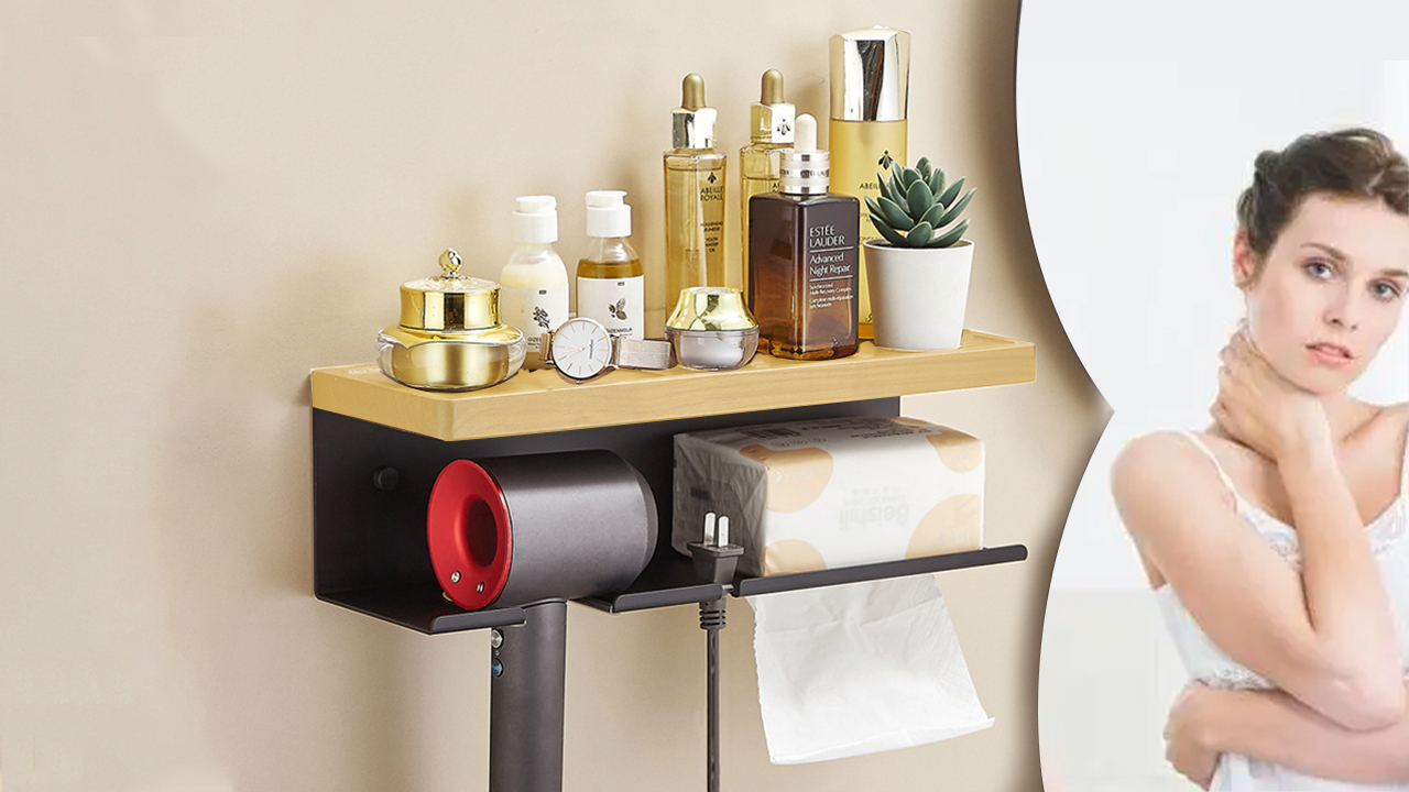 Porta Asciugacapelli Da Muro Adesivo - Con Supporto Rasoio E Portacavi, Senza Fori