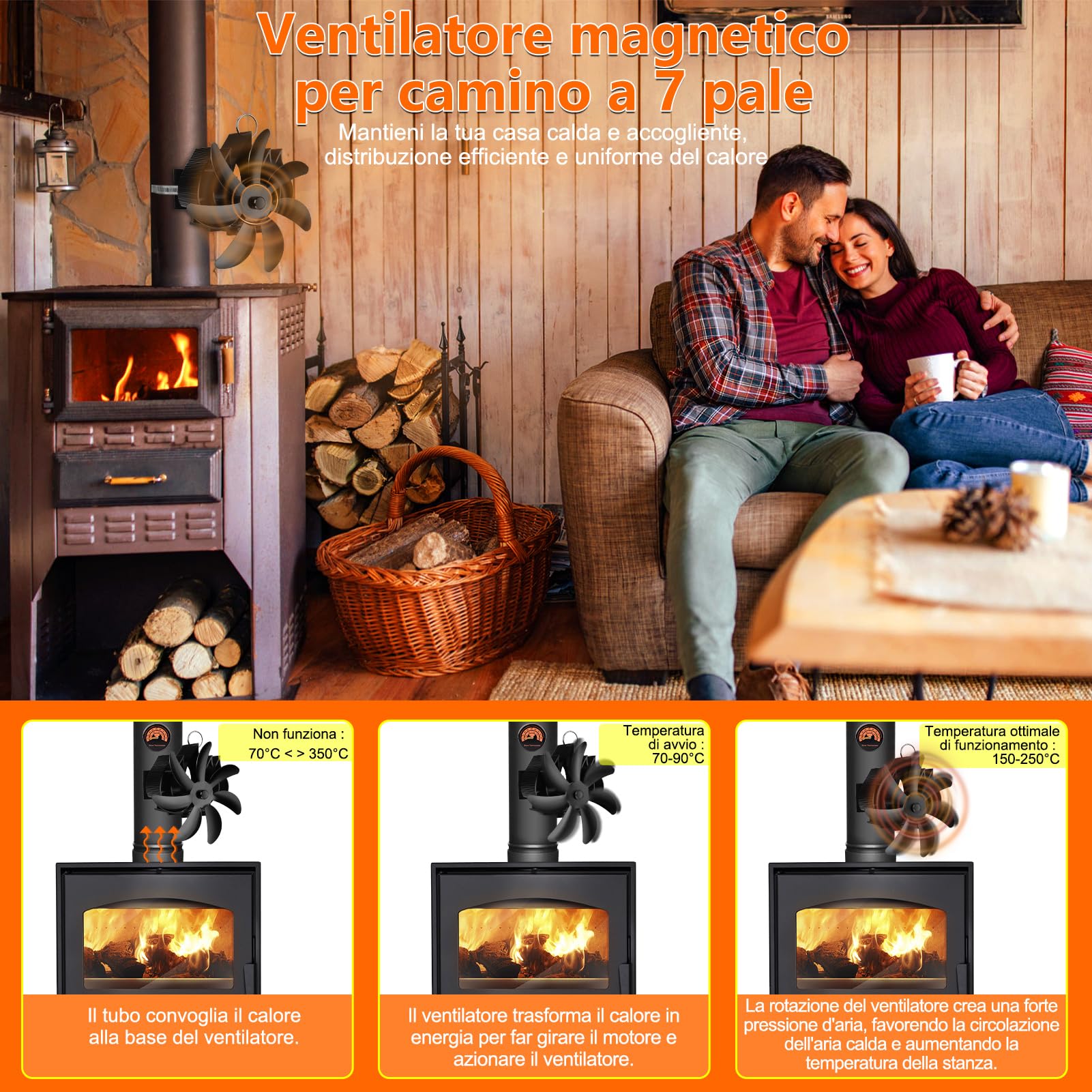 Vuoi diffondere meglio il calore della tua stufa a legna? Questo ventilatore magnetico funziona senza elettricità! Si attiva con il calore e gira silenziosamente, spingendo l'aria calda in tutta la stanza. Fatto in alluminio anodizzato, resistente alle alte temperature. Design sicuro con maniglia anti-scottatura e protezione surriscaldamento. Fino a 150 CFM di flusso d'aria. Installazione semplice: lo appoggi sulla stufa e il magnete tiene fermo. Risparmia energia e scalda uniformemente. Provare per credere!Caratteristiche e scheda tecnica