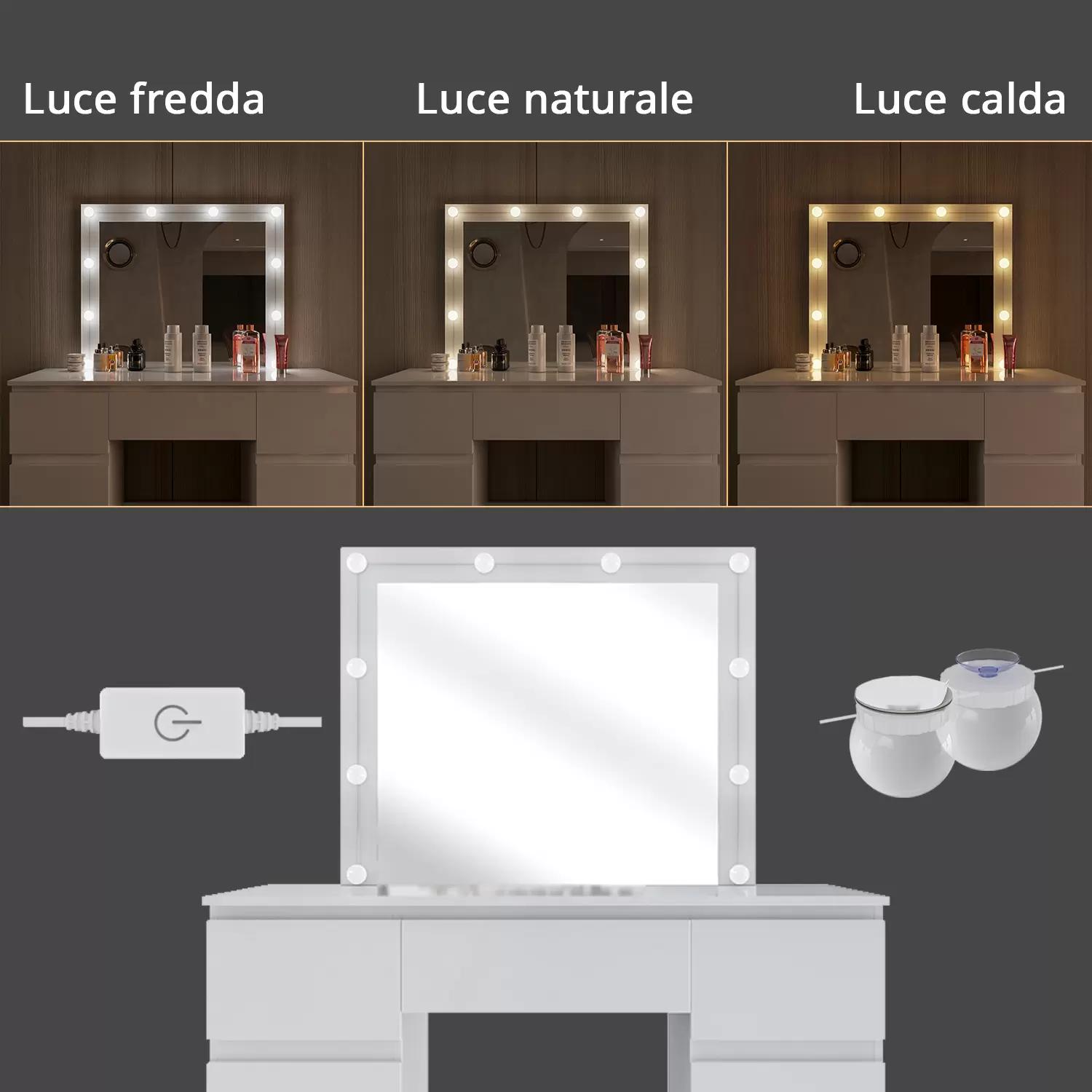 Che bellissima toeletta! È perfetta per creare la tua area beauty in camera da letto. Ha uno specchio LED con luci regolabili (calda, naturale, fredda) che si accendono al tocco, così puoi truccarti con la luce perfetta. In più, ha una presa USB/Type-C e ricarica wireless per tenere i device sempre carichi. Ci sono 4 cassetti spaziosi per organizzare cosmetici, gioielli e accessori. Le dimensioni sono 80x40x140 cm, è in truciolato melaminico di qualità e acciaio, con piedini regolabili. Design moderno ed elegante, un regalo fantastico per tutte le donne!Caratteristiche e scheda tecnica