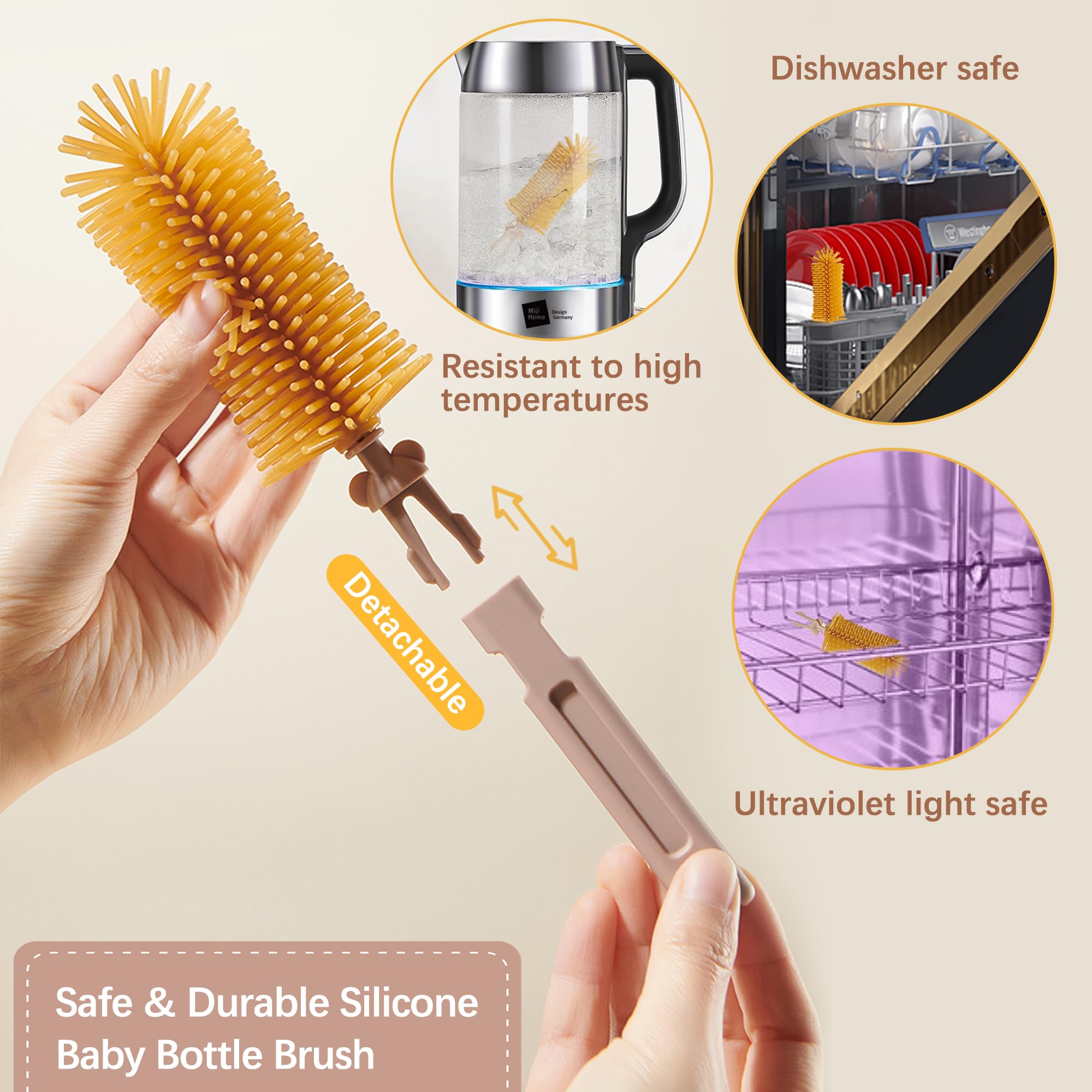Pulire biberon e ciucci non è mai stato così facile! Questo set di 3 spazzole in silicone è sicuro, senza BPA e resistente alle muffe. Le setole morbide non graffiano e raggiungono ogni angolo, anche nei punti più difficili. Il manico lungo è comodo da usare, e la base inclusa ti aiuta a tenerle in ordine e igienizzate. Perfette non solo per biberon, ma anche per thermos, cannucce, tiralatte e altro. Un alleato indispensabile per i genitori che vogliono garantire pulizia e sicurezza ai propri piccoli. Colore verde chiaro, carino e pratico!Caratteristiche e scheda tecnica